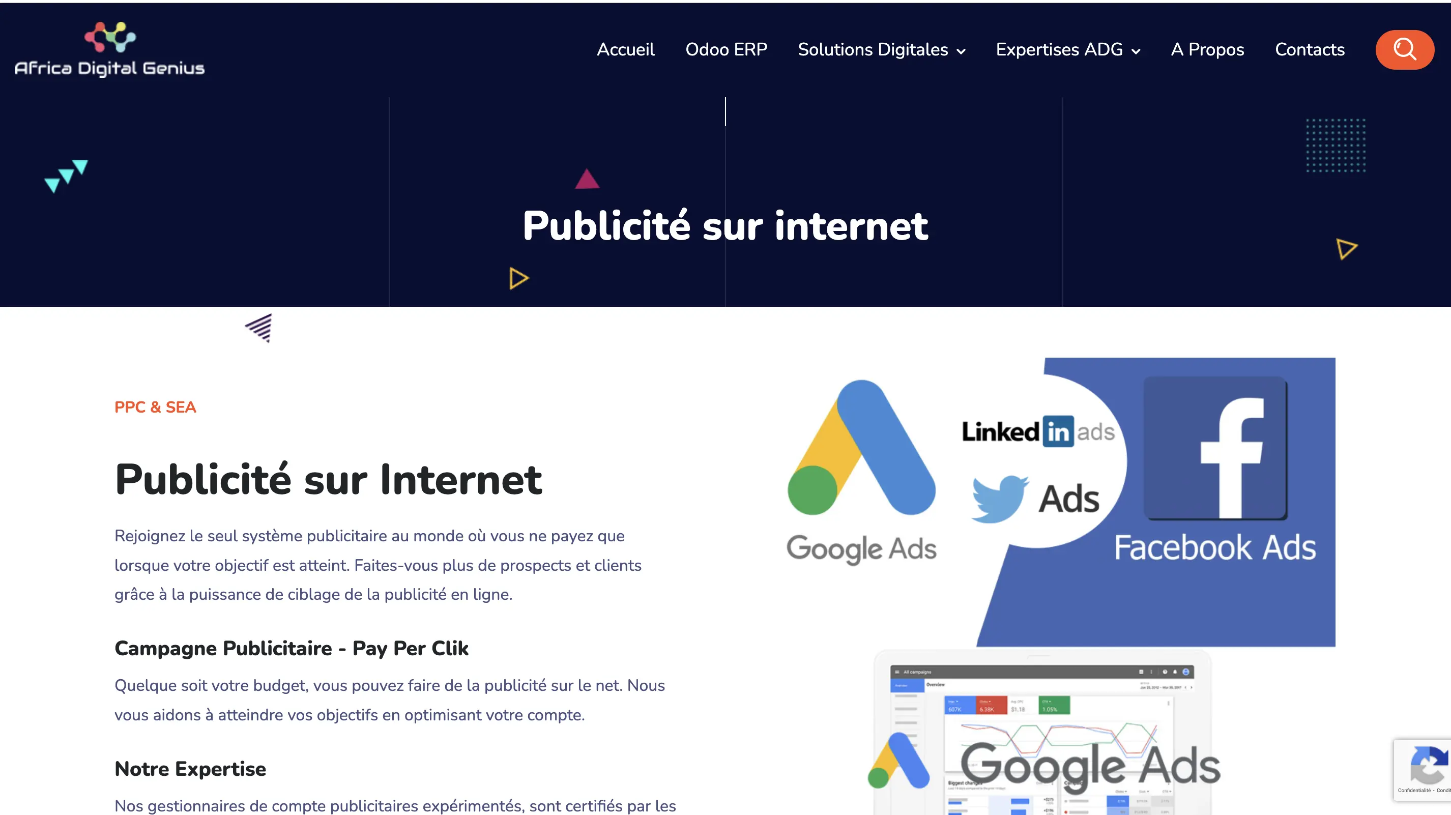 Filiale d'ITELEGES-GROUP, ADG est une startup africaine spécialisée dans l'intégration de solutions digitales innovantes et la communication digitale. Elle propose des campagnes PPC adaptées aux besoins spécifiques des entreprises africaines.